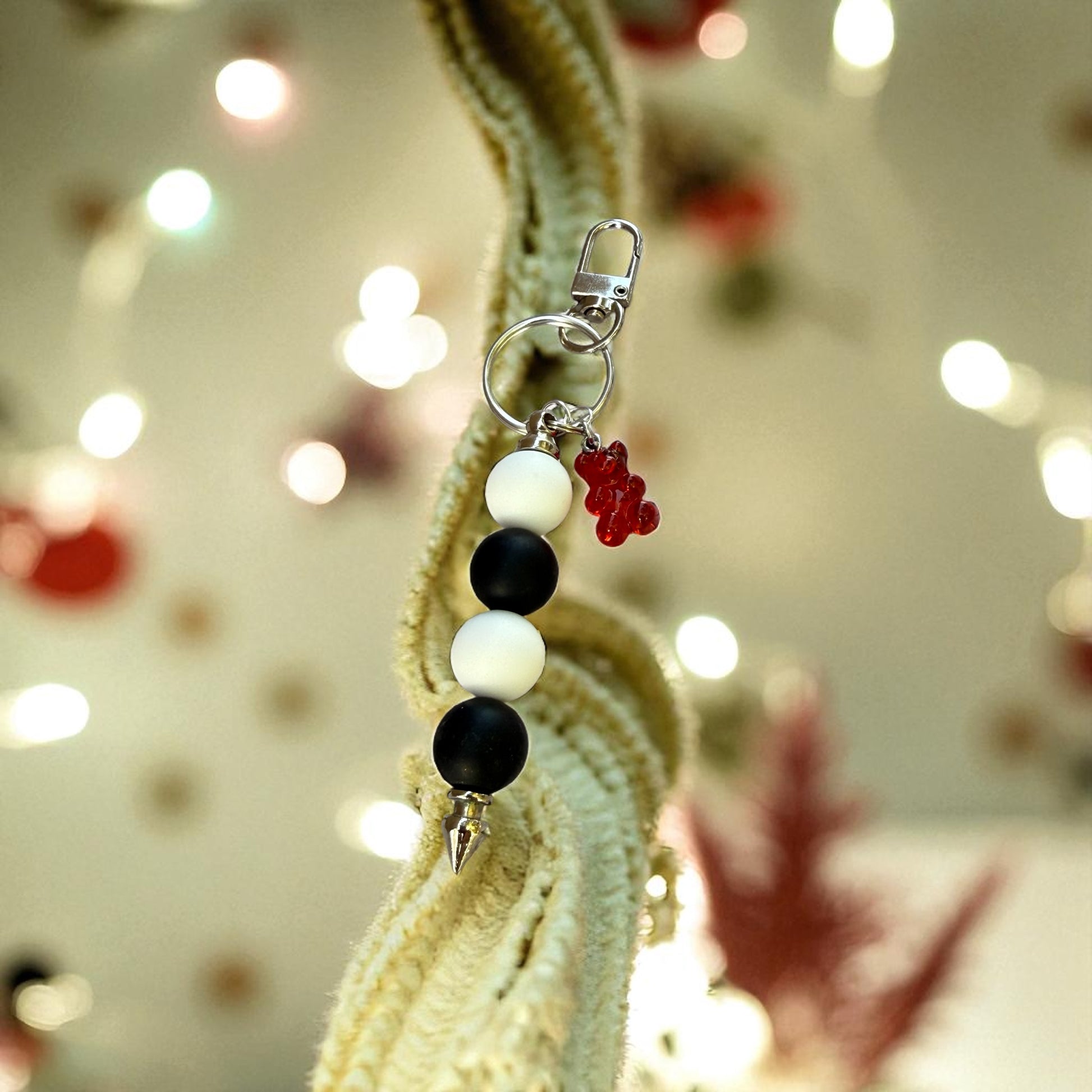 This black and white silicone bead keychain is a modern classic with a twist—featuring a glossy red bear charm that adds a fierce yet friendly vibe. The monochrome beads offer sleek contrast and everyday versatility, while the crimson bear stands out as a symbol of strength, warmth, and a little wild-hearted fun.
