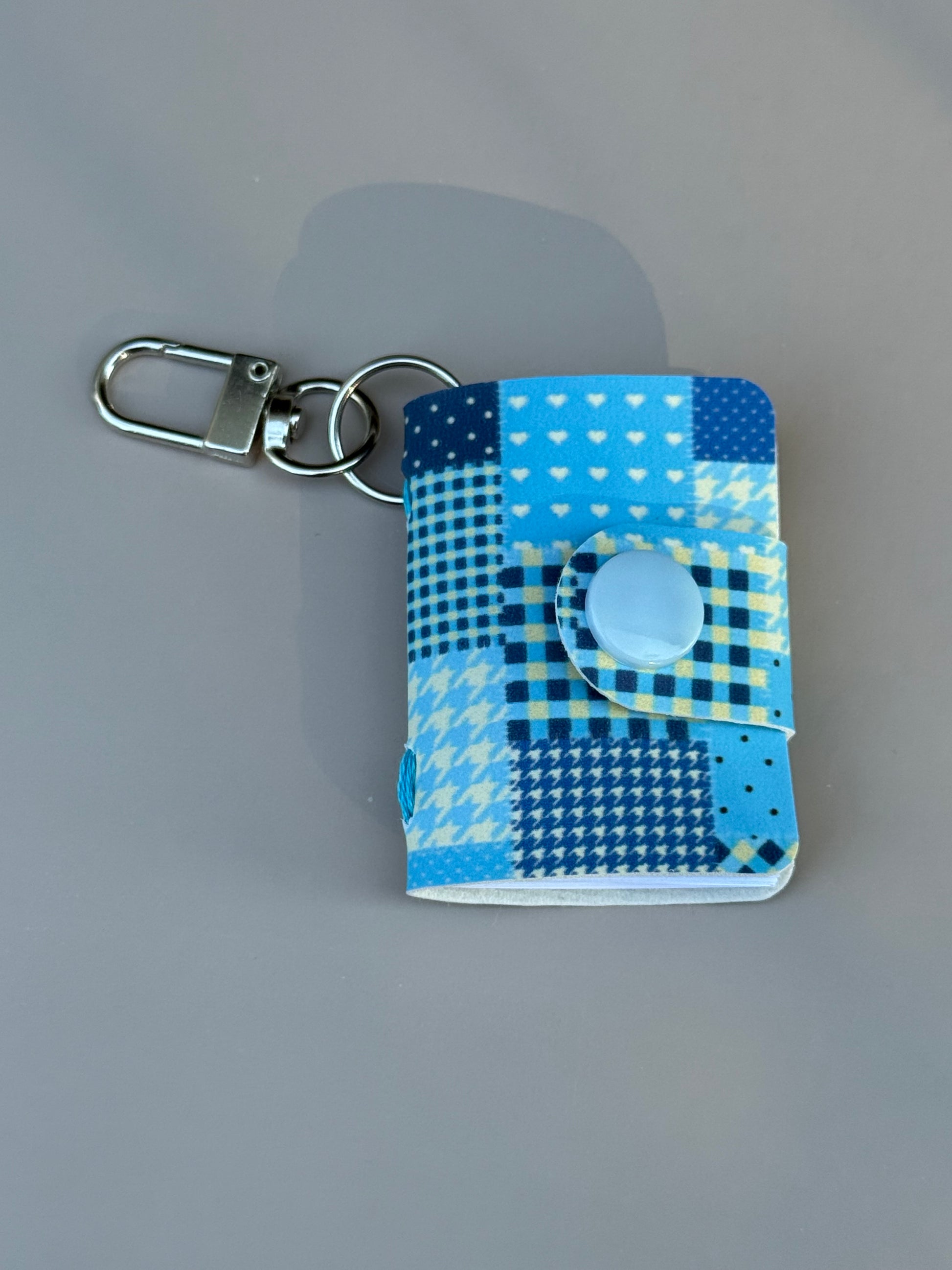 Meet Cerulean Memento—a pocket-sized patchwork of calm and character. This keychain notebook blends classic patterns like gingham, houndstooth, and polka dots in a soothing spectrum of blues, from sky to deep navy. Secured with a soft blue snap and finished with a sleek silver clasp, it’s designed to tag along wherever inspiration strikes. Whether you’re jotting down a fleeting thought, last minute self reminder, or a tiny love note, this little companion brings a touch of elegance and nostalgia to your everyday.