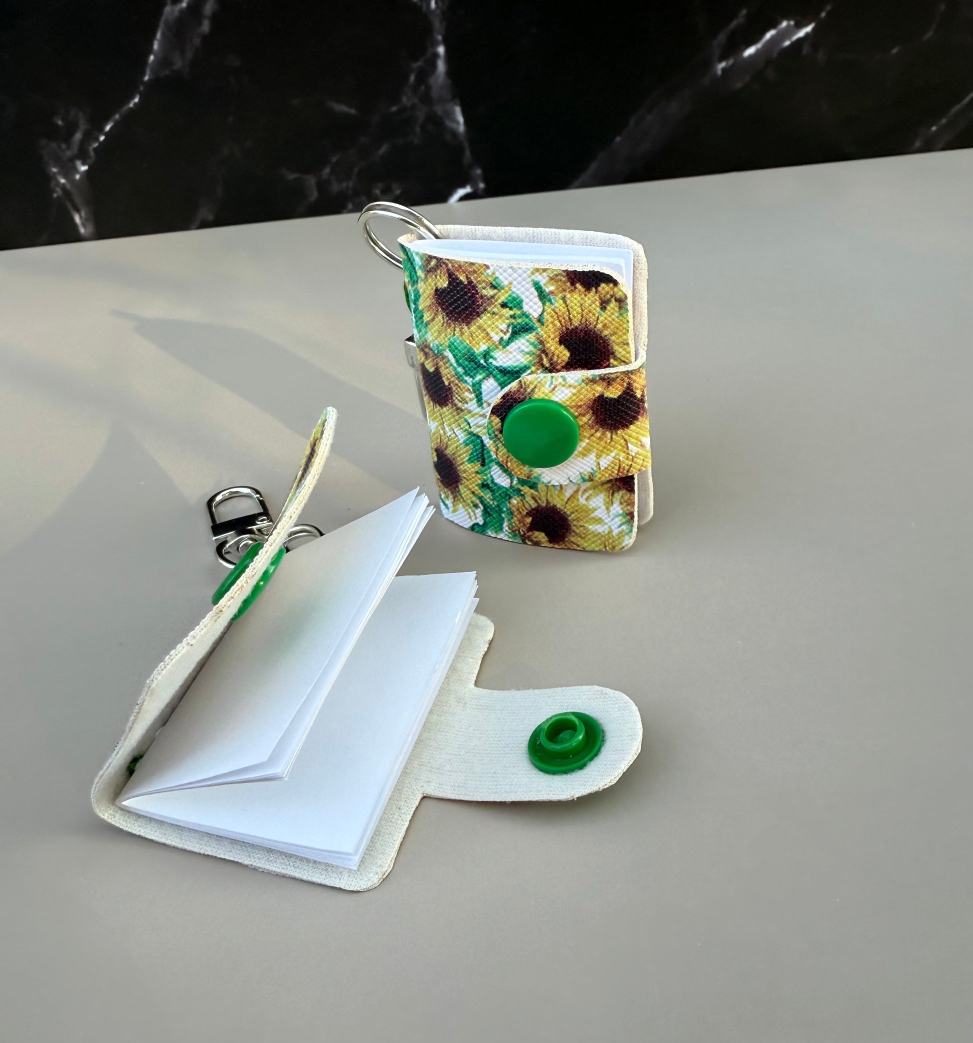 Celebrate the golden glow of summer with Midsummer Keepsake—a petite keychain notebook wrapped in a cheerful sunflower print. With vibrant yellow blooms and lush green leaves dancing across a crisp white background, this tiny treasure brings warmth and whimsy wherever it goes. A matching green snap keeps your notes secure, while the silver clasp lets you clip it to your keys, tote, or backpack for easy access. Whether you’re jotting down bright ideas or heartfelt thoughts, this sunny sidekick is a pocket-sized burst of joy.