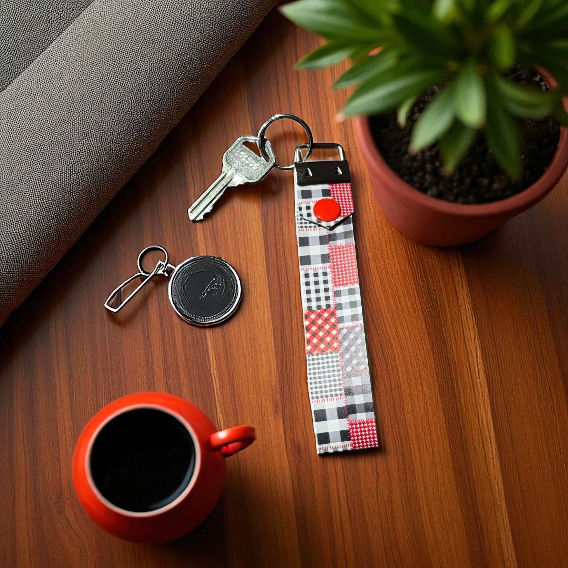 Add a touch of rustic style to your everyday essentials with the Patchwork Charm Keychain. Featuring a bold red snap closure and a playful mix of plaid and patchwork patterns, this keychain is both practical and stylish. Its sturdy strap design makes it easy to slip over your wrist or spot in your bag, while the metal clasp and keyring keep your keys secure. Perfect for those who love a pop of color with a cozy, homespun vibe, this keychain blends functionality with charm.